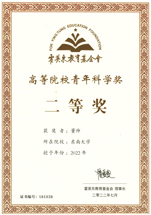 近日,霍英东教育基金会第十八届高等院校青年科学奖及教育教学奖正式揭晓,新葡的京官网董帅教授荣获高等院校青年科学奖二等奖。这是新葡的京官网教师首次获此殊荣。