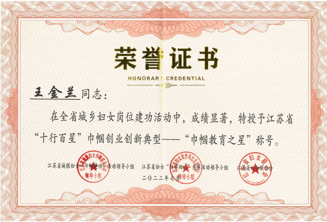 近日校工会传来喜讯,新葡的京官网王金兰教授获2022年度江苏省“十行百星”巾帼创业创新典型——“巾帼教育之星”称号(此荣誉全省仅10名)。 | |