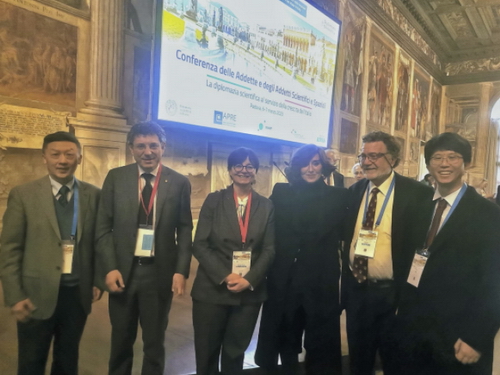 图注:2023年3月7日在意大利帕多瓦举行的“2023年科学与太空专员会议”,ICRA将王瑜的主席任命通报给意大利大学和研究部部长Anna Maria Bernini教授。(照片左起:中国驻意大利大使馆沈建磊公使参赞、Cineca主席Francesco Ubertini博士、前意大利大学和研究部部长/现国家研究委员会主席Maria Chiara Carrozza博士、意大利大学和研究部部长Anna Maria Bernini教授、ICRANet主任雷莫·鲁菲尼教授和新任ICRA主席王瑜教授。)