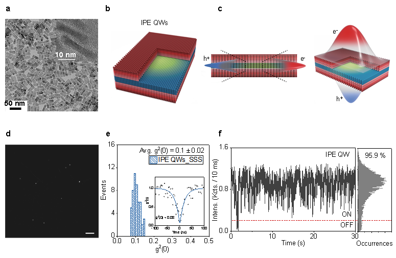 在量子技术应用中,胶体纳米材料需具备高颗粒均匀性、高光致发光量子产率、窄发射线宽及快速发射速率等关键性能指标。尽管胶体零维量子点在室温单光子源研究中已取得显著进展,但其仍面临尺寸分布不均和严重非辐射俄歇复合等问题,制约了其量子光源性能的进一步提升及其片上集成应用的发展。胶体准二维量子阱(colloidal 2D quantum wells)因其高发射均匀性、优异的光致发光量子产率及室温下的窄线宽等特性,被视为实现高性能单光子源的理想体系。然而,其较大横向尺寸所导致的激子环境敏感性与多激子发射现象,长期以来阻碍了其作为单光子源的可行性。