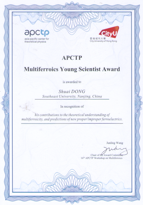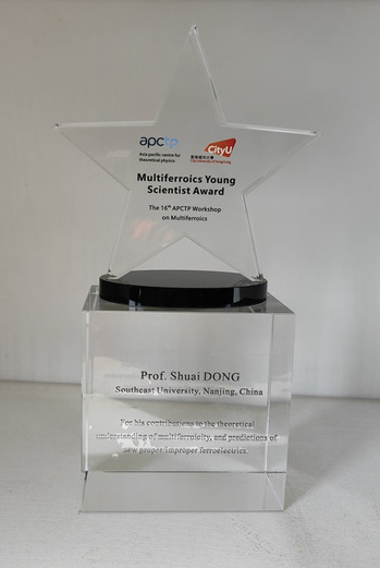 近日,第十六届亚太理论物理中心多铁材料会议(The 16th APCTP Workshop on Multiferroics)在香港城市大学顺利举行。会议期间,组委会开展了相关奖项的评选与颁发工作。新葡的京集团35222vip董帅教授凭借其在理论理解多铁性以及预测新型正规/非正规铁电体的贡献(for his contributions to the theoretical understanding of multiferroicity, and predictions of several new proper/improper ferroelectrics),荣获“多铁材料青年科学家奖”(Multiferroics Young Scientist Award)。该奖项专门授予亚太地区在多铁材料和物理领域贡献突出的青年科学家(45岁以下)。