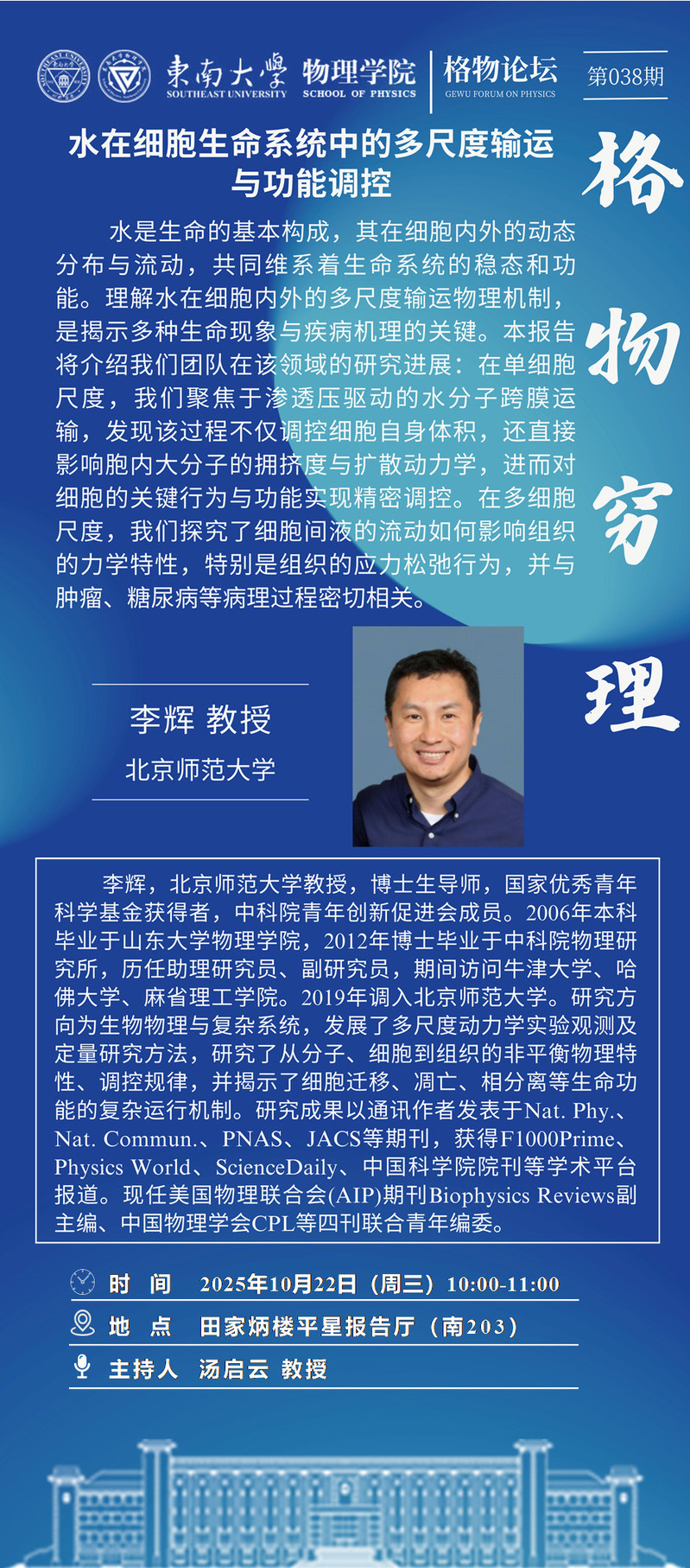 10月22日周三10:00格物论坛|水在细胞生命系统中的多尺度输运与功能调控