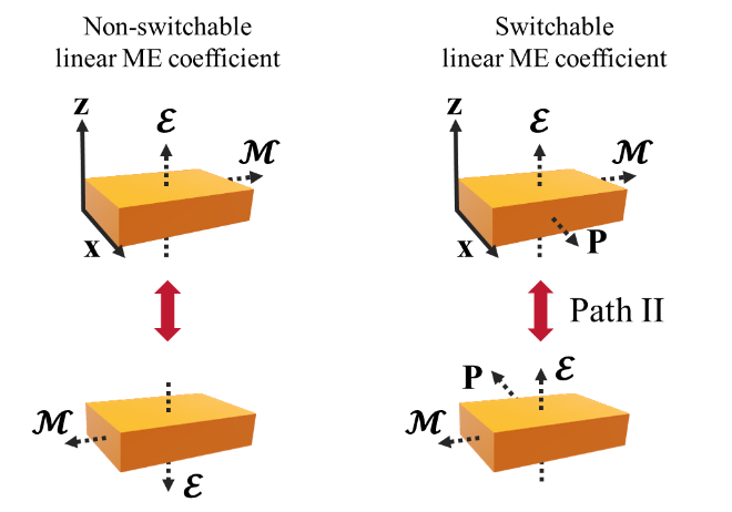 左图.传统线性磁电响应,即磁电系数不改变,磁性的反转只能通过外电场(ε)实现而与铁电性无关,具有易失性。右图.铁电反转磁电系数,即外电场(ε)只助力磁性的产生,磁性的反转可以通过反转铁电性实现,具有非易失性。