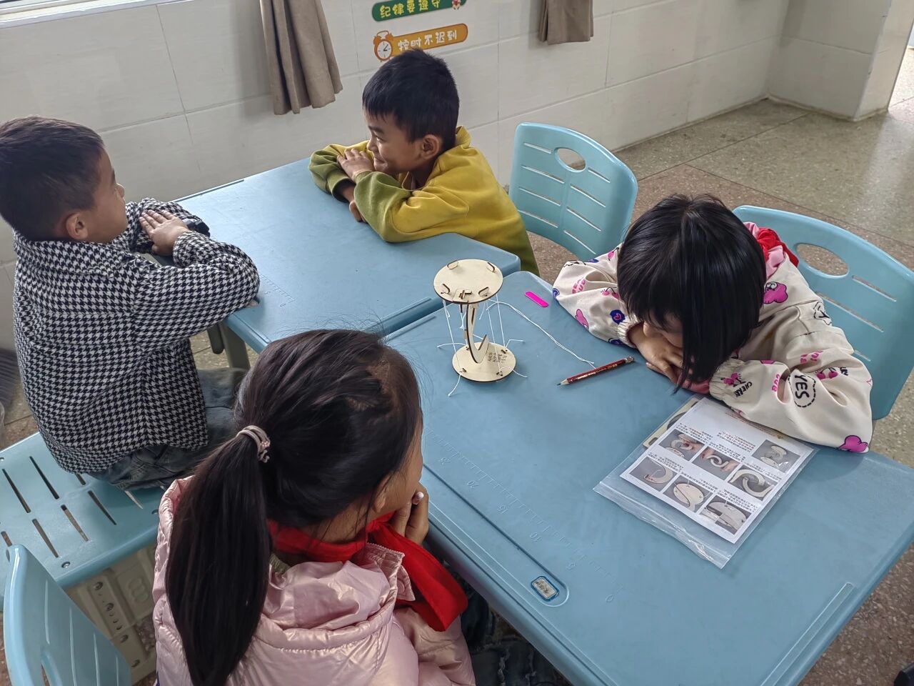 在团田乡支教手工课上,朱益辉同学和郭琳同学利用现成的张拉结构组件,带领孩子们探索“张拉结构”的力学奥秘。