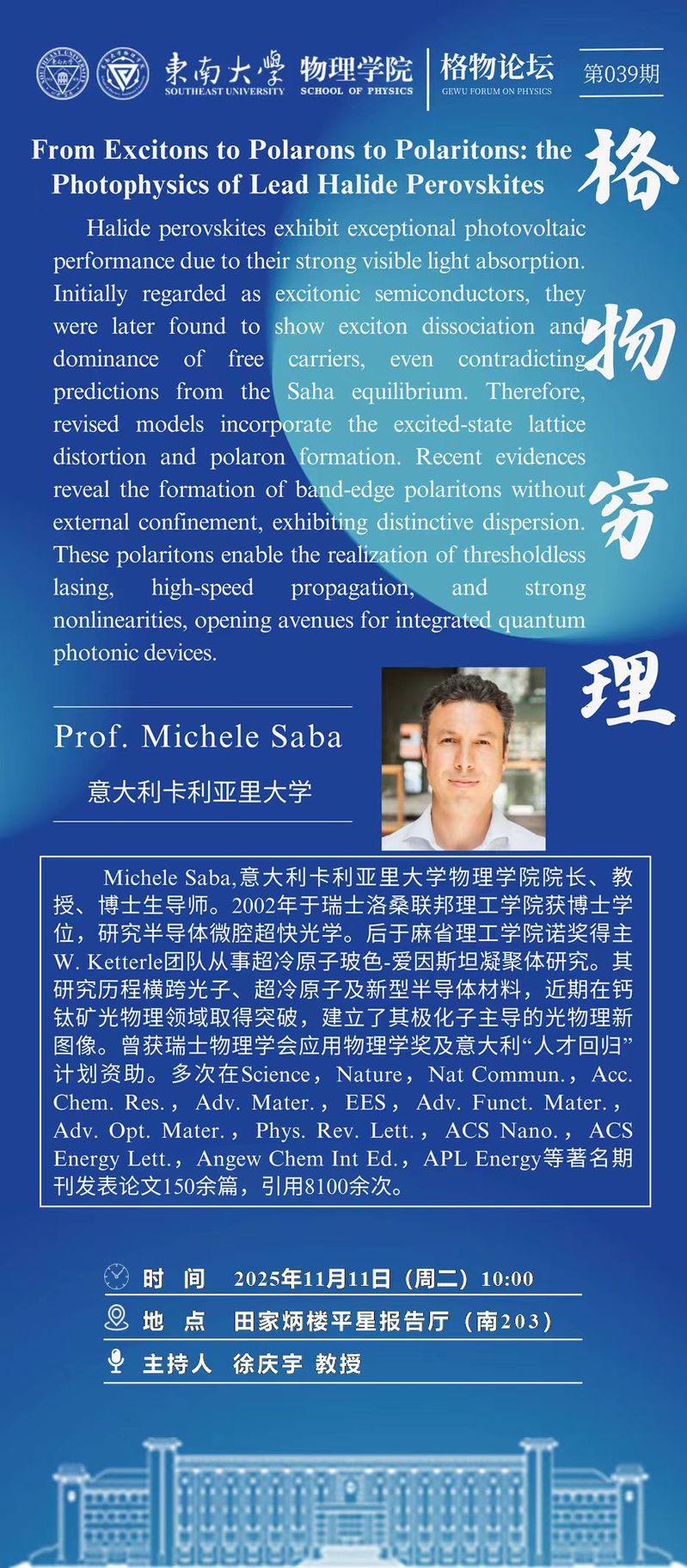 11月11日周二10:00格物论坛|From Excitons to Polarons to Polaritons: the Photophysics of Lead Halide Perovskites