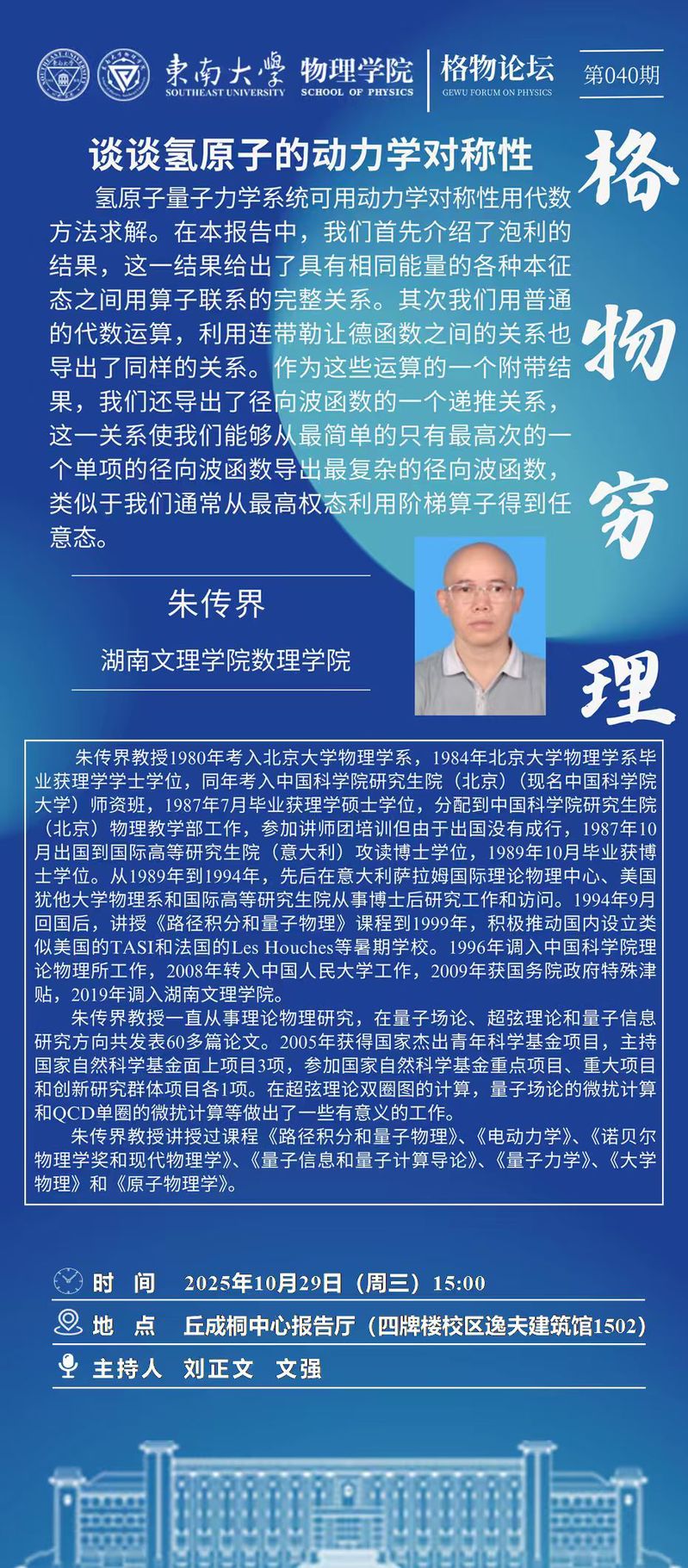 10月29日周三15:00格物论坛|谈谈氢原子的动力学对称性