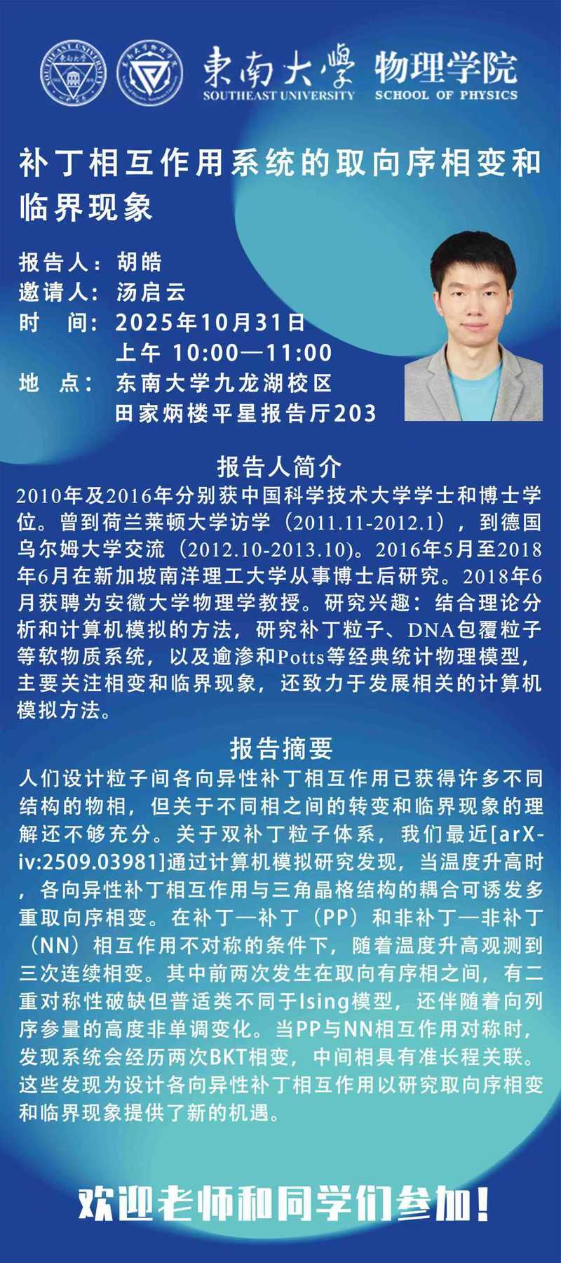 10月31日周五10:00学术报告|补丁相互作用系统的取向序相变和临界现象