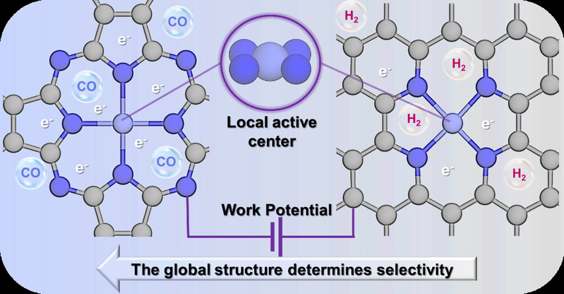 “结构决定性质”是材料设计与优化的基本原则。基于这一原则,催化剂的局域结构,尤其是活性中心的几何与电子特征,被视为决定催化性能的关键。然而,在复杂催化体系中,局域结构主导的结构–性能关系常常失效:即使活性位点相似,性能仍可能迥异。以CO2还原反应为例,实验发现,具有相同CoN4活性中心的两类单原子催化剂,氮掺杂碳载体(CoNC)与酞菁载体(CoPc)负载Co单原子催化剂,在产物选择性上截然不同。其中,CoPc更倾向生成CO,而CoNC则主要生产H2。这一现象揭示了局域结构描述的不足,因而亟需引入包含全局结构效应的新理论框架,以全面理解催化性能的调控机理。