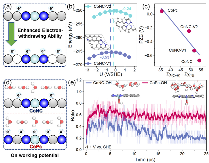 针对这一问题,团队结合恒电位密度泛函理论与从头算分子动力学模拟,系统探索了CoNC与CoPc的电子结构与界面行为。结果表明,尽管两者局域活性中心的几何和电子结构十分接近,其全局结构差异却显著影响催化剂的零电荷电位(PZC)及界面电荷分布,进而调控电子承载能力与界面水分子取向。这一差异最终导致了完全相反的CO2还原反应选择性。进一步研究还发现,“全局结构效应”的强弱取决于局域活性位对整体结构变化的敏感性。本研究揭示了“局部结构决定性能”范式的局限性,并提出了通过调控载体全局结构(如引入碳空位)优化催化选择性的新策略,为单原子催化剂的理性设计提供了新的思路。