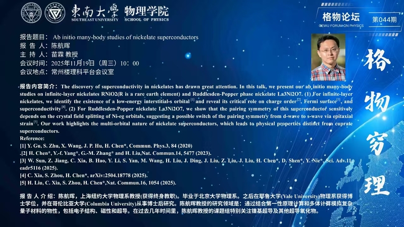 11月19日周三10:00格物论坛|Ab initio many-body studies of nickelate superconductors