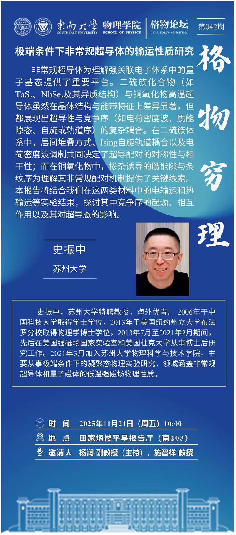 11月21日周五10:00格物论坛|极端条件下非常规超导体的输运性质研究