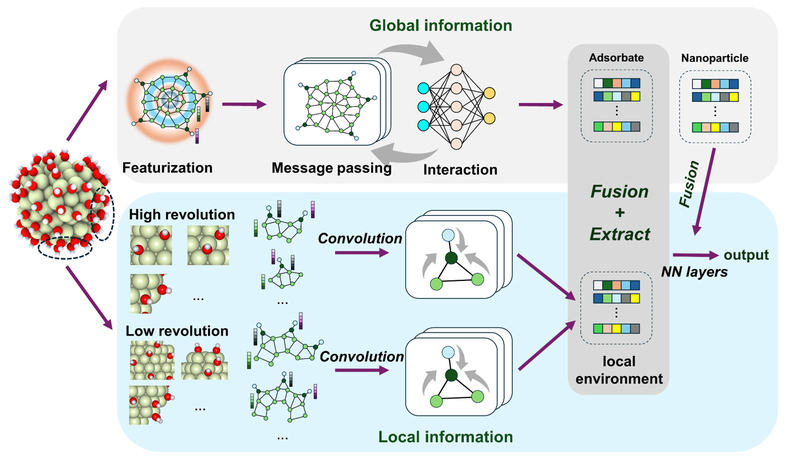 针对这一难题,团队通过机理分析与数据驱动相结合的方法,成功构建了一个全局描述符,用以揭示Cu纳米颗粒在CO2还原反应中的尺寸效应。研究指出,Cu纳米颗粒的表面氧化程度是连接其微观结构与宏观催化性能的重要全局性质。进一步,团队发展了一个名为ScaleNet的多尺度神经网络框架(如图所示),通过将全局和局部信息有机结合,突破了传统密度泛函理论在处理实验尺度纳米颗粒时的计算瓶颈。对于一个DFT需要花费超过104天(数万天)才能完成的计算任务,ScaleNet仅需约102秒(几分钟)即可完成,计算效率提升了107倍。利用这一框架,团队成功模拟了多个实际尺寸Cu纳米颗粒的表面*OH吸附状态并确定不同尺寸下*OH的最优覆盖度。同时,*OH的最优覆盖度与实验中观察到的催化活性和选择性高度吻合。该成果不仅验证了*OH覆盖度作为描述纳米催化剂整体性能的可靠全局描述符,也为未来纳米尺度催化剂的设计和筛选提供了新的思路和技术手段。