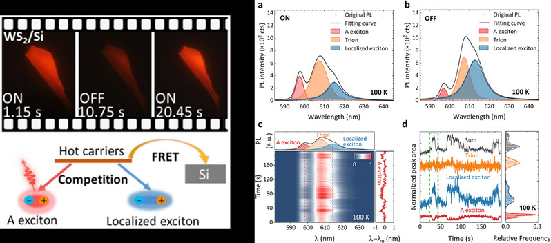光致发光闪烁是低维材料体系中广泛存在的一类动态光学现象,常被视为探究缺陷态、载流子俘获/解俘获动力学以及界面能量转移行为的重要窗口。尽管针对量子点、纳米线等0D与1D材料的闪烁机制已有较为全面的报道,但二维材料体系中的闪烁研究仍处于初步阶段。现有研究仅观察到A型闪烁,其具体成因尚未完全明确。倪振华、吕俊鹏教授团队以WS2/Si异质结界面为模型体系,结合荧光寿命-强度分布(FLID)、温度依赖荧光测量与瞬态吸收光谱等多种手段,首次发现二维材料体系中的B型闪烁现象,观测到了荧光强度发生显著波动而寿命保持稳定的典型B型闪烁特征,这是二维材料及其异质界面体系中首次报道此类现象。同时,该工作发现A激子与局域激子发光随时间呈现明显的反相关关系,揭示了B型闪烁源于A激子与局域激子之间的占据竞争。而且,该研究表明明WS2/Si 界面中发生的Förster共振能量转移会动态调节局域激子密度,抑制陷阱态饱和,使闪烁得以维持。本研究提出的激子竞争与界面能量转移模型,不仅为理解二维材料中激子-缺陷相互作用提供了新的物理图景,也为未来二维材料光电器件的界面设计、缺陷调控策略、发光稳定性优化 提供了理论依据与技术参考,对于推动二维材料在高性能光电器件、异质集成系统以及新型光源中的应用具有重要意义。