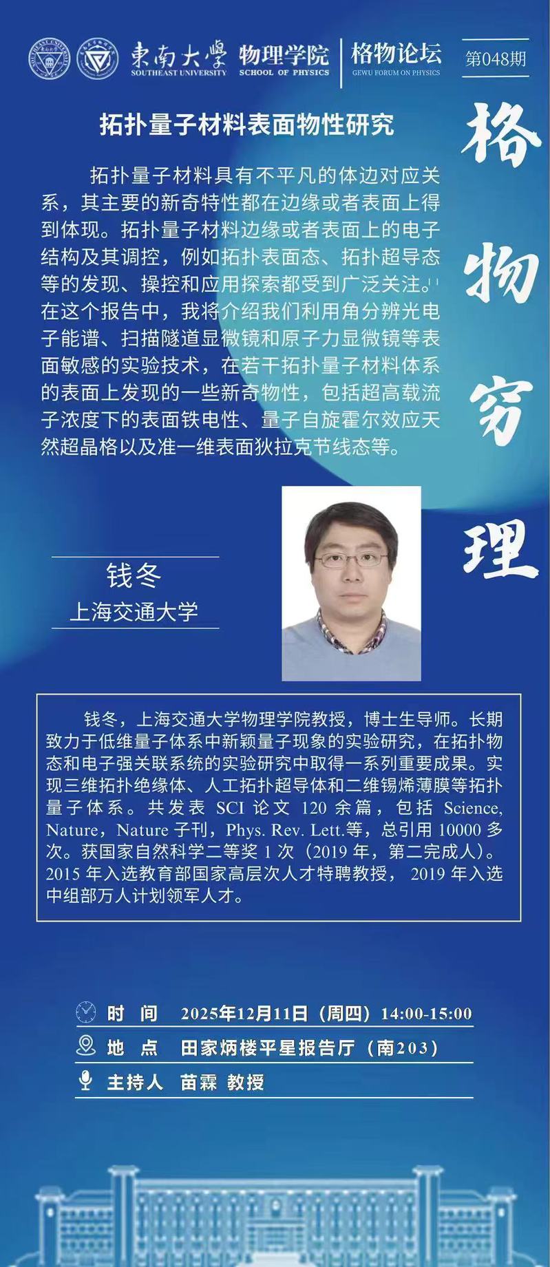 12月11日周四14:00格物论坛|拓扑量子材料表面物性研究