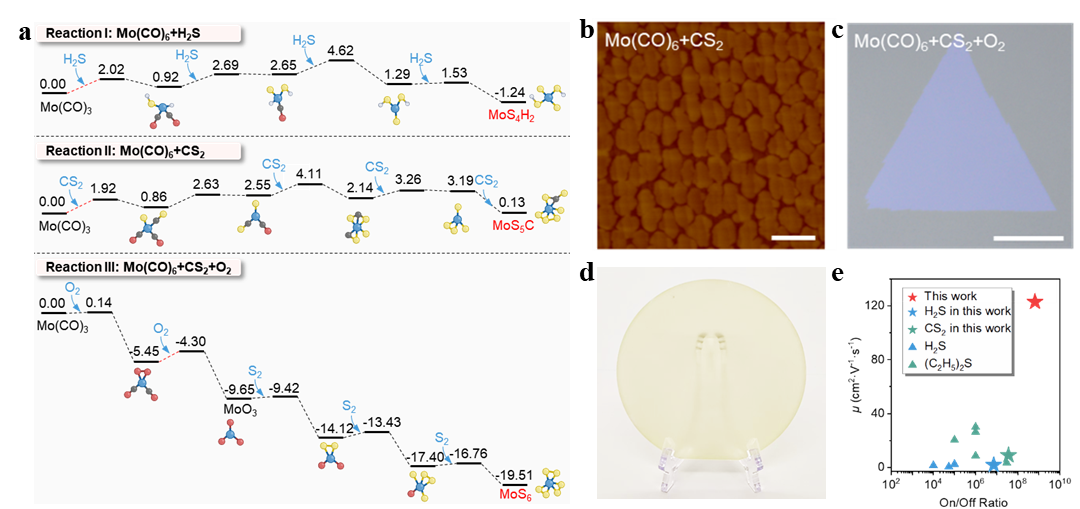 王金兰教授团队基于第一性原理计算模拟,系统揭示了传统MOCVD技术的反应动力学瓶颈。计算结果表明,传统MOCVD中Mo(CO)6的硫化反应能垒高达2.02 eV,严重限制了生长速率,导致晶畴尺寸仅达纳米级,并引入碳污染。团队进一步研究发现,通入氧气后,反应路径发生根本性转变:Mo(CO)6和CS2与氧气发生预反应,生成三氧化钼(MoO3)和单质硫作为活性中间体。该策略实现了对生长动力学的精准调控—与传统路径相比,它将放热反应的焓变绝对值提升了15倍,并将反应能垒从2.02 eV显著降低至1.15 eV,从而将前驱物反应速率提高了约3个数量级;同时,该策略从根源上抑制了含碳中间体形成,从而彻底规避碳污染,确保材料超高纯度,这为MoS2大尺寸、高品质单晶外延生长提供了基础理论支撑,为后续工艺设计提供了明确方向。