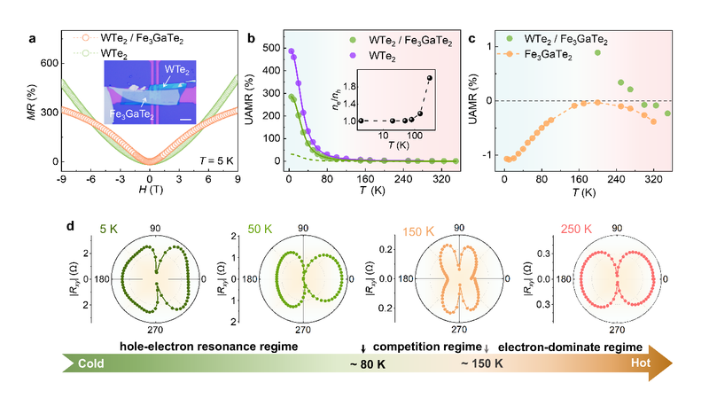 二维WTe₂作为典型的空穴-电子补偿半金属,其电子带与空穴带在费米能级附近共存,并在动量空间呈高度对称分布,为探索突破传统库仑约束的自旋输运机制提供了理想平台。基于此,研究团队构建了WTe₂/Fe₃GaTe₂范德华异质结构器件,并通过角度依赖和温度依赖磁输运实验系统研究了空穴-电子共振对非传统各向异性磁阻(UAMR)和横向输运的影响。