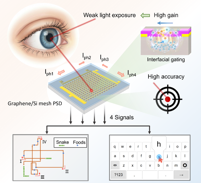 眼动追踪可以通过测量眼球运动来揭示用户的注意力和意图,提供了一种高效、直观的人机交互方式。然而,目前主流基于视频的眼动追踪系统虽然能达到亚度级精度,但不可避免的需要采集和处理大量冗余像素数据,导致系统功耗大。理想的眼动追踪系统需要兼具高追踪频率、高精度和低功耗,而现有技术难以兼顾。针对这一问题,团队提出并开发了一种石墨烯光导网格状位置敏感探测器(PSD),成功构建了高效节能的眼动追踪系统 。