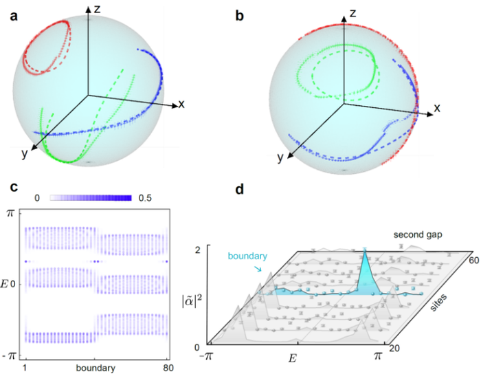 在此基础上,研究团队进一步构造具有不同拓扑荷的两个区域,并在两者之间形成拓扑“畴壁”。如图2(c)所示,在畴壁附近可以出现局域化的拓扑边界态,其空间分布明显不同于体态。为了在实验中直接探测这些边界态,研究团队提出了一种空间分辨的注入谱学测量方法。通过在畴壁附近注入光子并分析其动力学演化,可以提取边界态的准能谱位置。如图2(d)所示,实验测量结果与理论预测一致,表明体系中确实存在由拓扑结构决定的边界态。