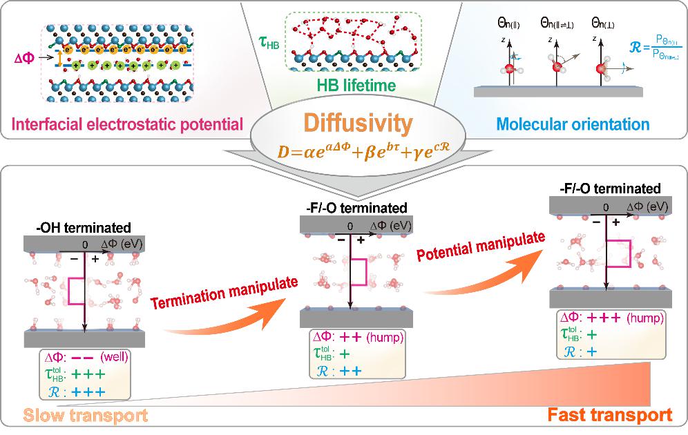 针对上述问题,研究者采用On-the-fly机器学习加速的从头算分子动力学模拟与多尺度实验表征相结合,系统研究了受限水形态演化与其扩散特性间的内在关联。研究发现,-OH官能团由于能与水分子形成大量稳定的界面氢键,将水分子锚定在界面处,导致极低的扩散速率。相反,-F和-O官能团能促使水分子表现出超快传输特性,这与界面静电势垒升高、氢键寿命缩短以及水分子取向无序密切相关。基于此,确定了界面静电势差、氢键寿命与水分子取向比例这三个决定受限水扩散的核心因素,创新性地构建了指数线性组合的扩散模型(如图所示),为调控纳米限域水行为提供理论框架。