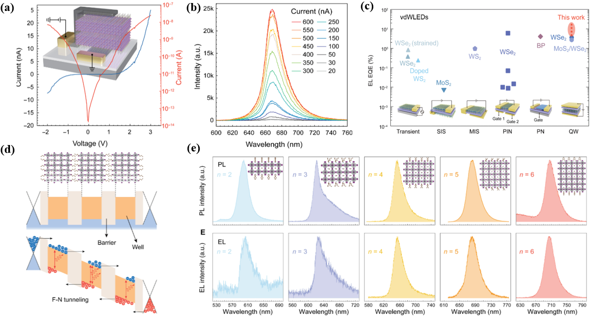 The capabilities of light-emitting diodes (LEDs) based on two-dimensional materials are restricted by efficiency roll-off, which is induced by exciton–exciton annihilation, at high current densities....