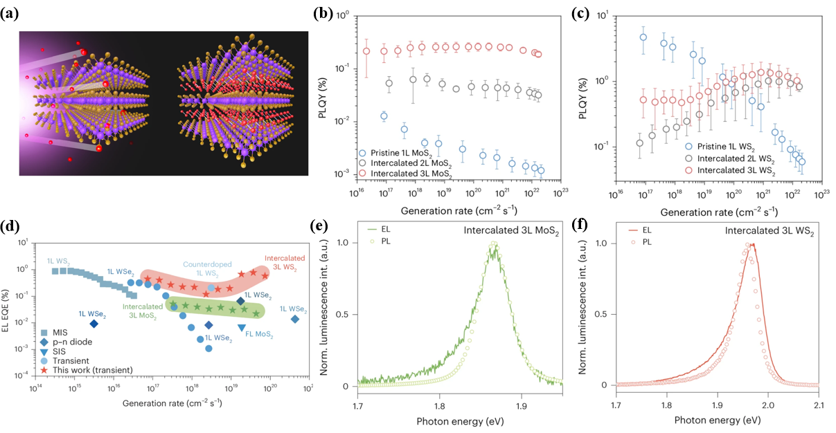 Light-emitting diodes based on intercalated transition metal dichalcogenides with suppressed efficiency roll-off at high generation rates